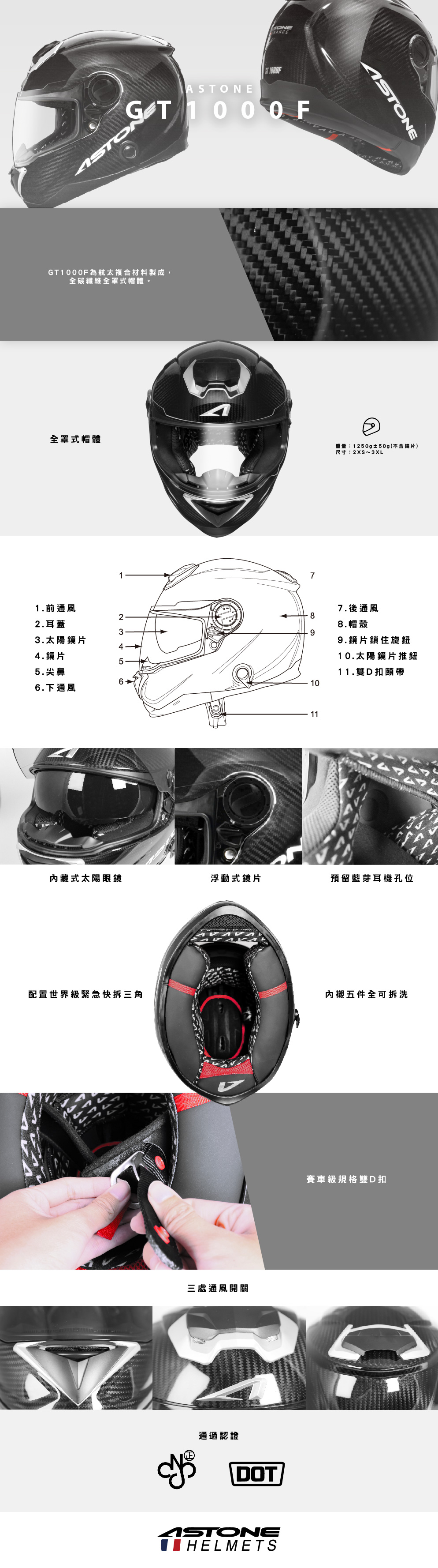 • 航太複合材料製成,全碳纖維全罩式帽體。