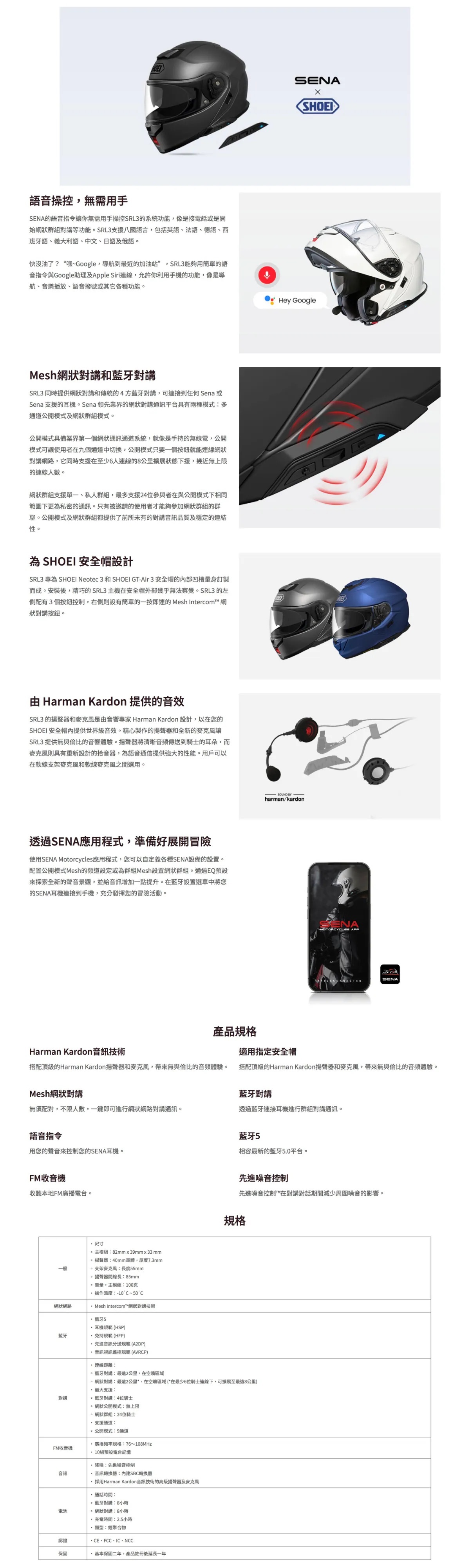 Sena 專為 SHOEI 安全帽: Neotec 3、GT-Air 3、J-Cruise 3而設計,SRL3是您騎行的完美通訊系統。