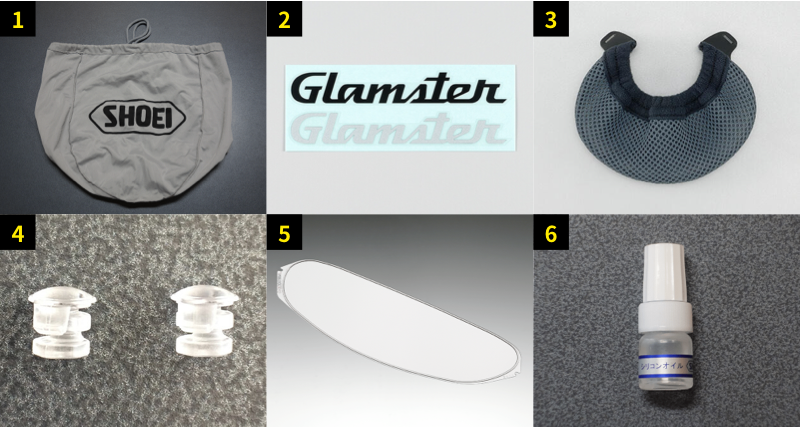 ▲ 1-專用布袋 / 2-貼紙 / 3-下巴網 / 4-除霧片扣子 / 5-除霧片 / 6-矽油